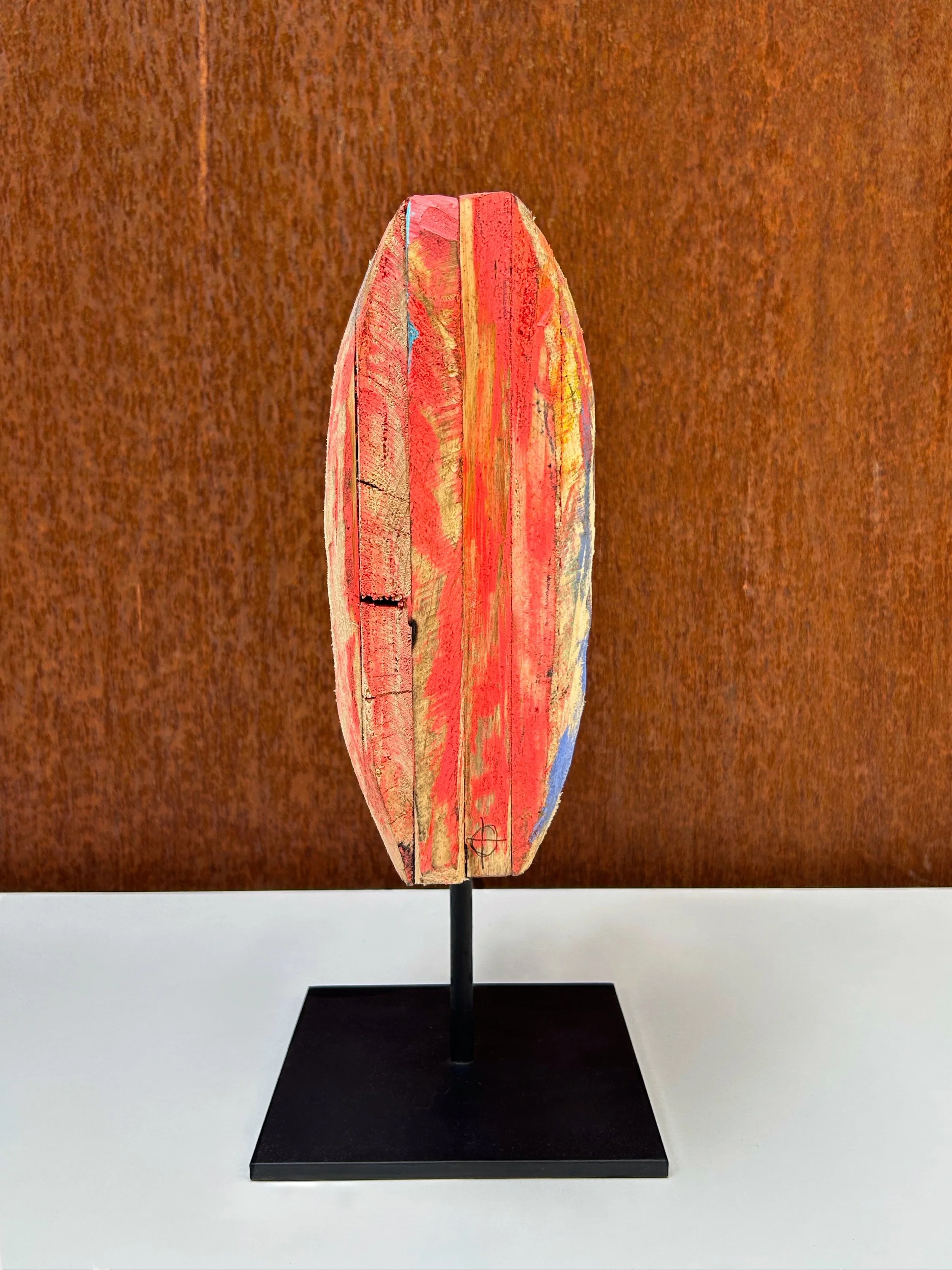 Made from laminated pine boards that have been chainsawed, painted and burnt. Comes on a metal stand.